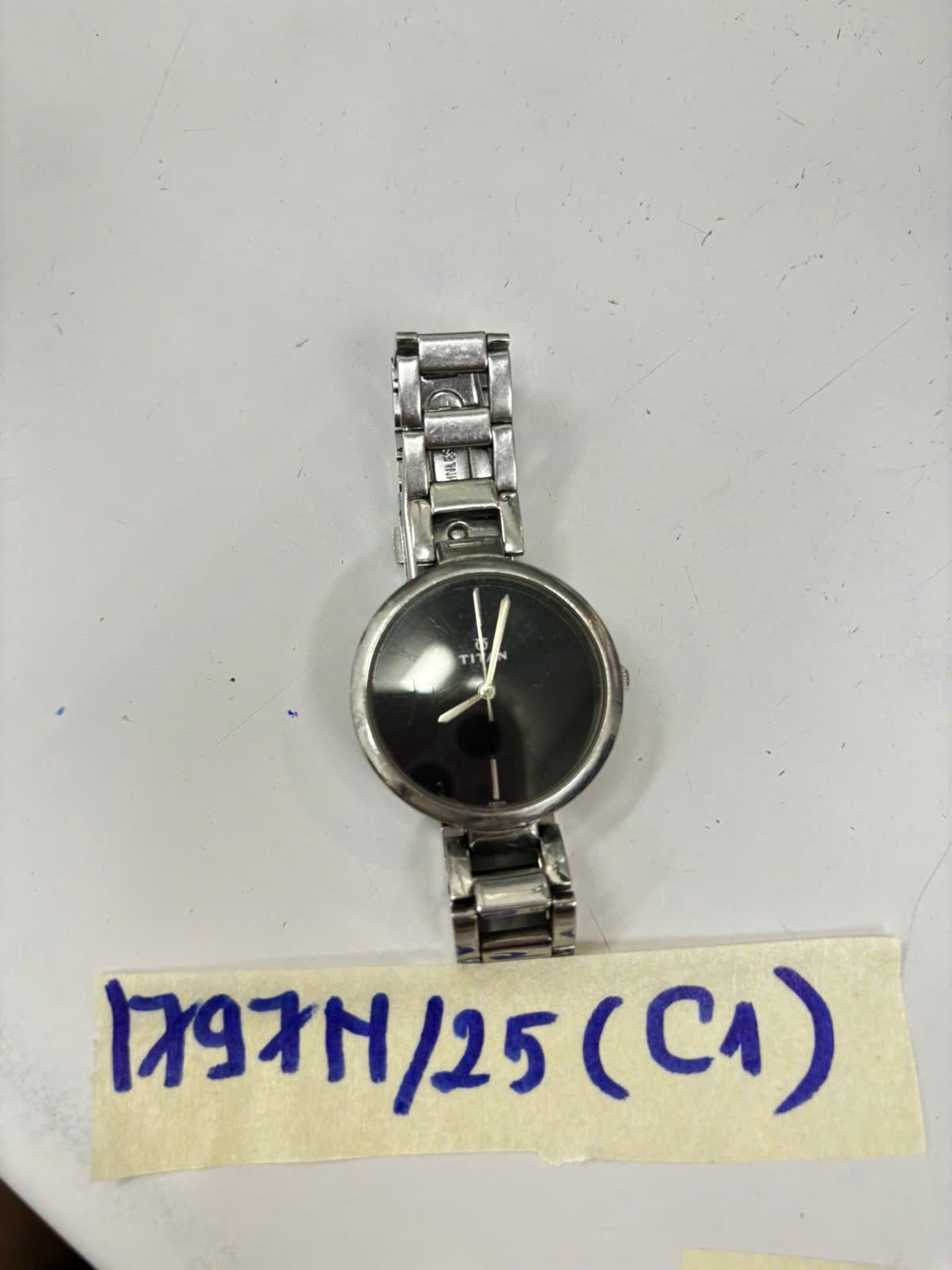 Mô tả: 01 đồng hồ hiệu titan dây màu kim loại mặt đen.