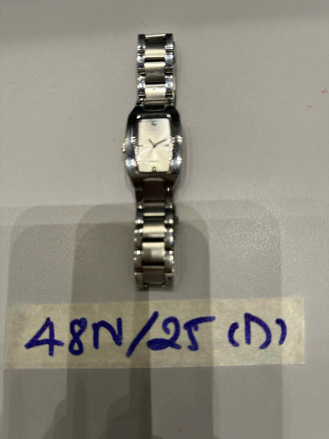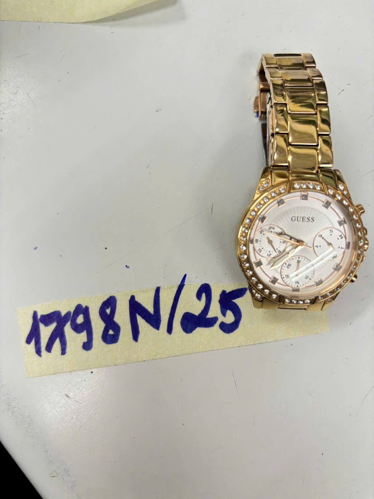 Mô tả: 01 đồng hồ kim loại màu trắng chữ "guess".