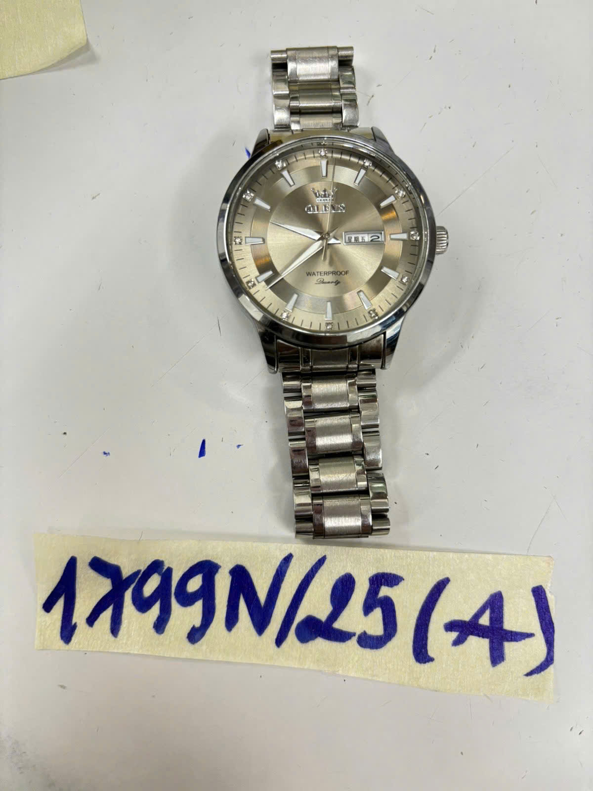 Mô tả: 01 kim loại màu bạc mặt hình tròn màu vàng nâu"olevs".