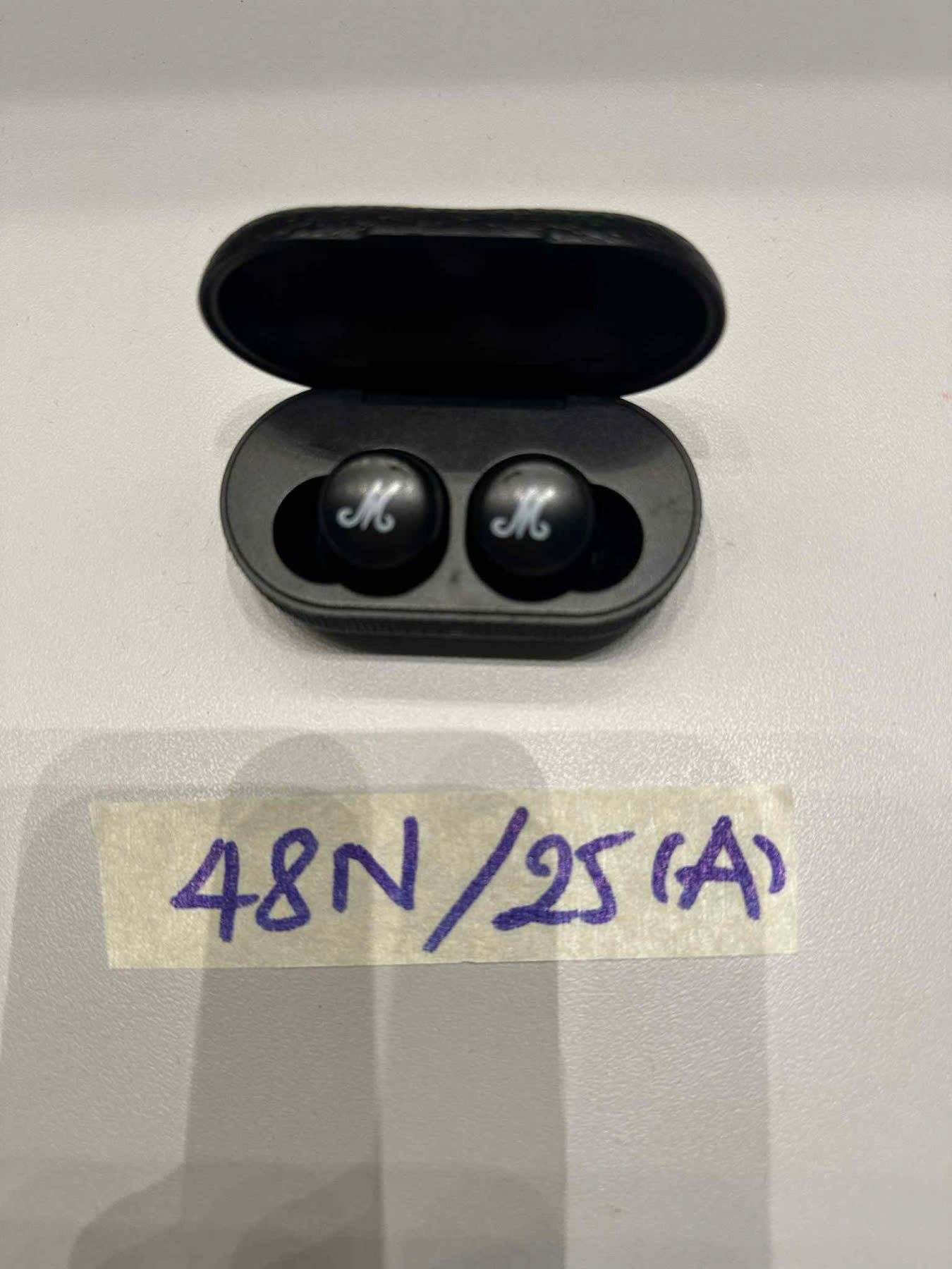Mô tả: 01 tai nghe không dây màu đen (hộp và 2 tai) có chữ "MARSHALL" đã qua sử dụng.