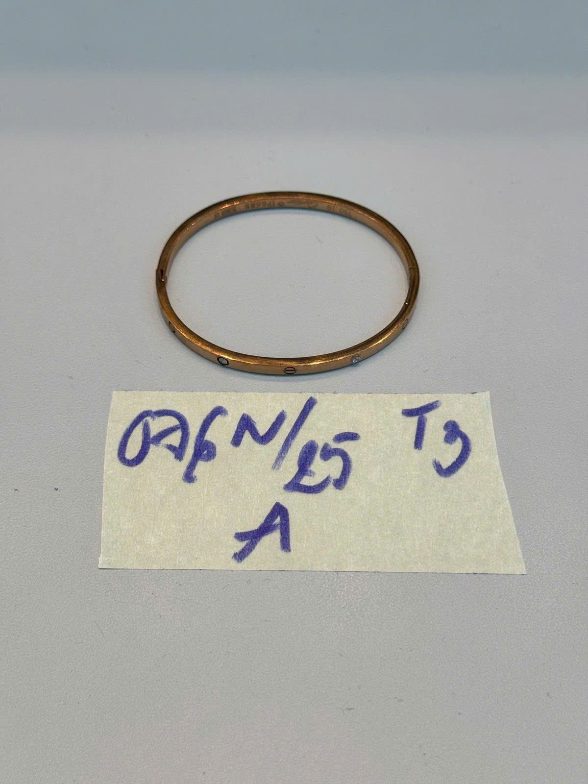 Ngày tiếp nhận: 31/10/2025 Mã hồ sơ: 76N2025A Mô tả: 01 vòng kim loại màu vàng có dính đá màu trắng có chữ 750.19 cartier.      |