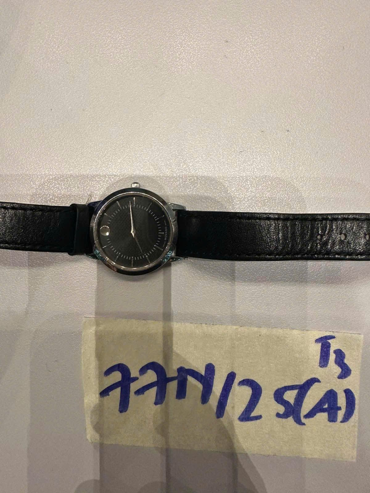 Ngày tiếp nhận: 03/11/2025 Mã hồ sơ: 77N2025A Mô tả: 01 đồng hồ da màu đen mặt tròn bên trong có chữ Movado.      |