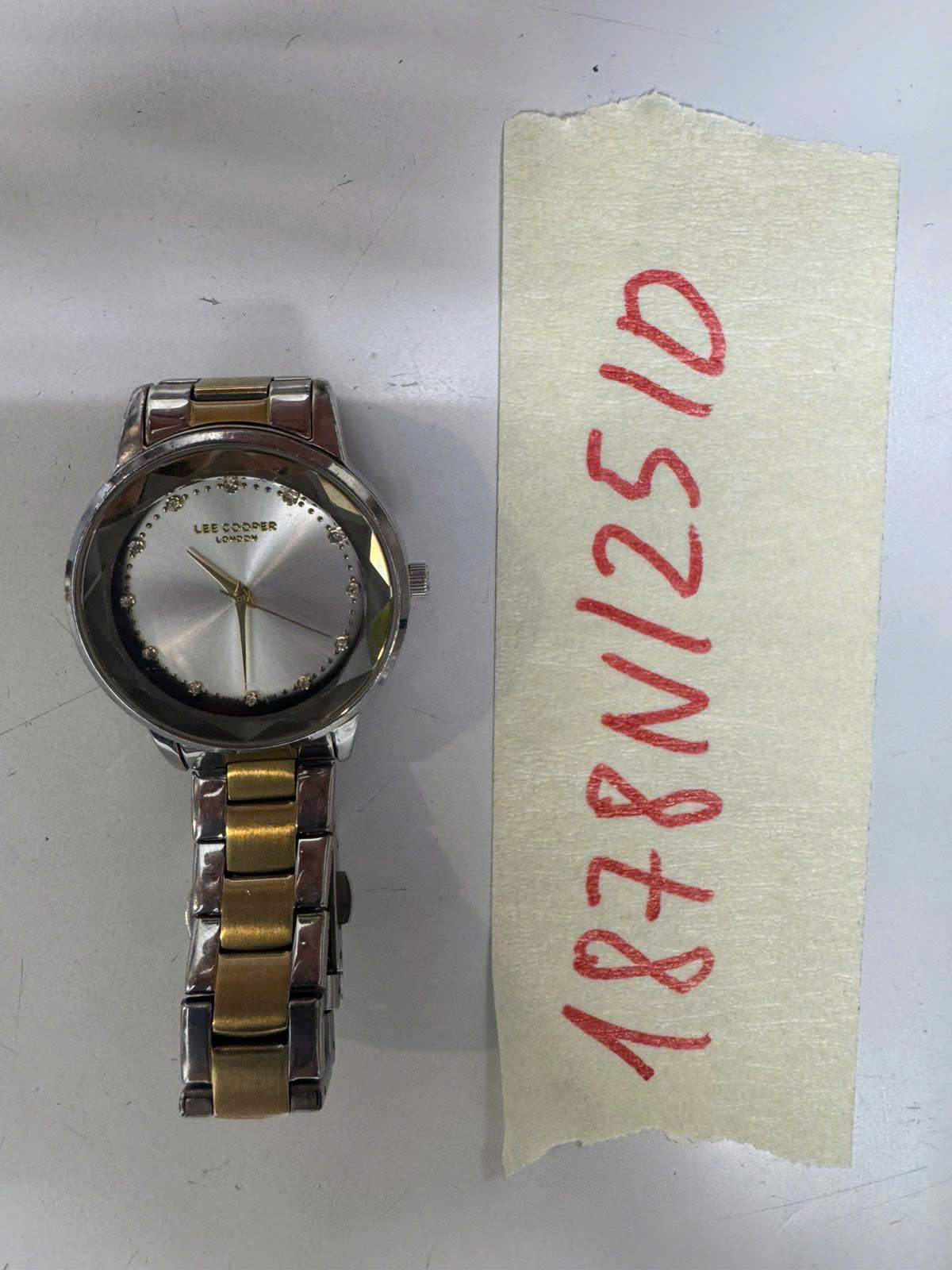 Ngày tiếp nhận: 20/10/2025 Mã hồ sơ: 1878N2025D Mô tả: 01 đồng hồ kim loại màu bạc xen màu vàng đồng, mặt tròn có chữ LEE COOPER LONDON. |