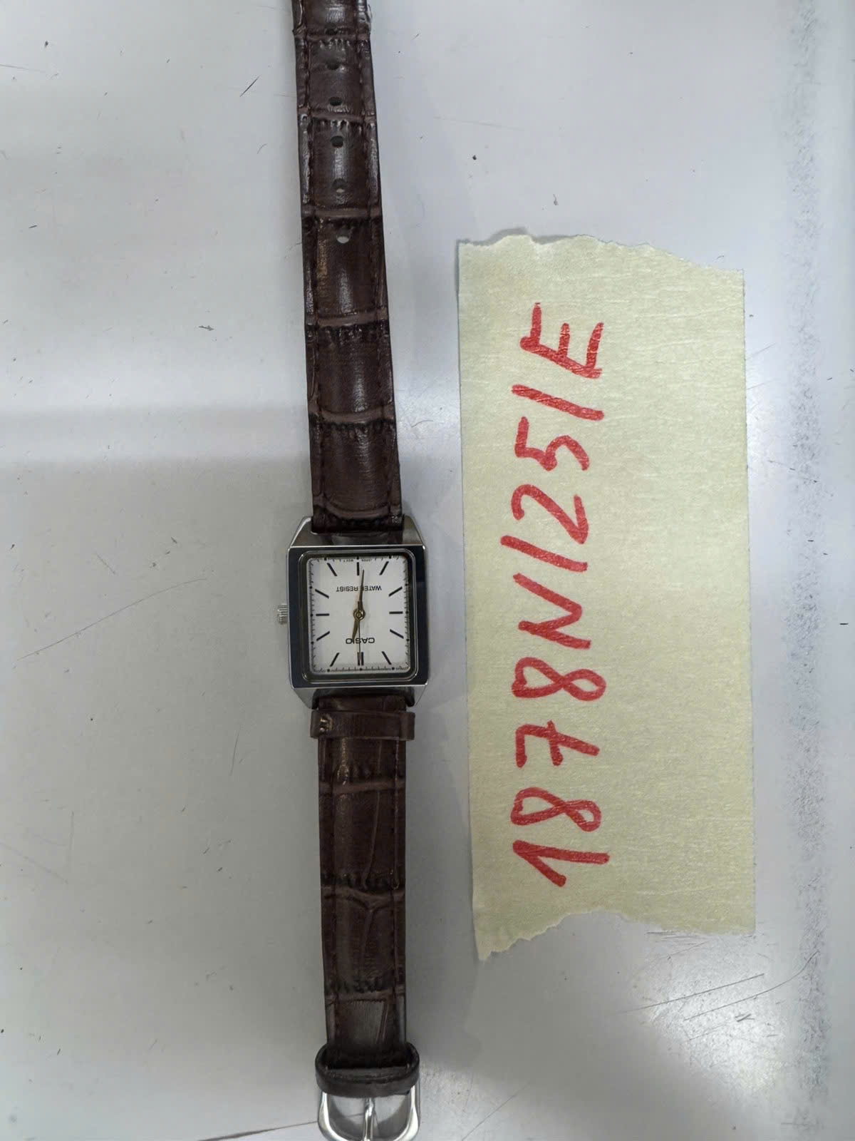 Ngày tiếp nhận: 20/10/2025 Mã hồ sơ: 1878N2025E Mô tả: 01 đồng hồ mặt vuông có chữ CASIO,dây màu nâu. |