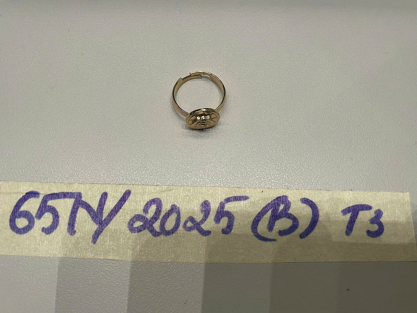 Ngày tiếp nhận: 20/10/2025 Mã hồ sơ: 65N2025B Mô tả: 01 nhẫn kim loại màu vàng mặt tròn. |