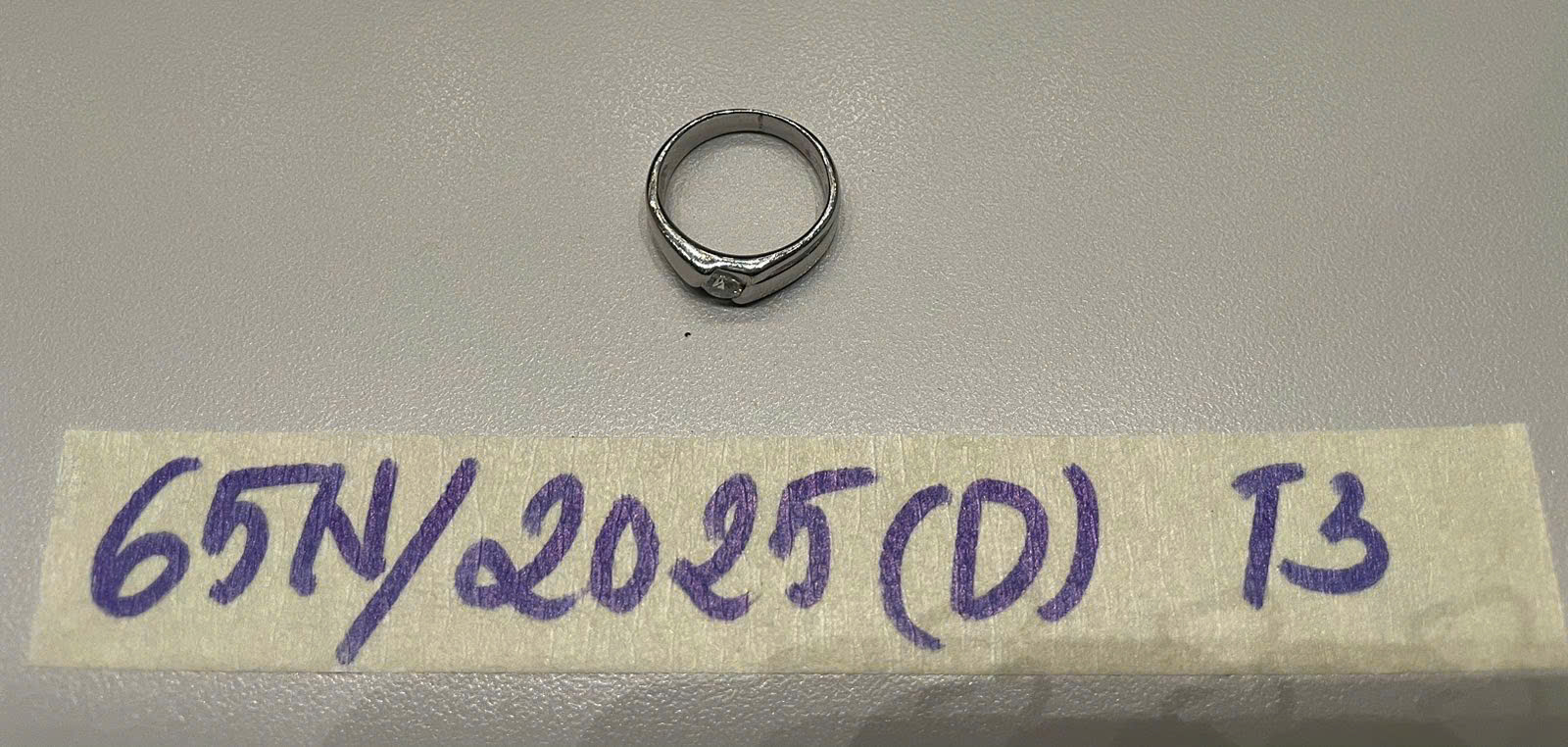 Ngày tiếp nhận: 20/10/2025 Mã hồ sơ: 65N2025D Mô tả: 01 nhẫn kim loại màu bạc, trên nhẫn có đính đỏ. |