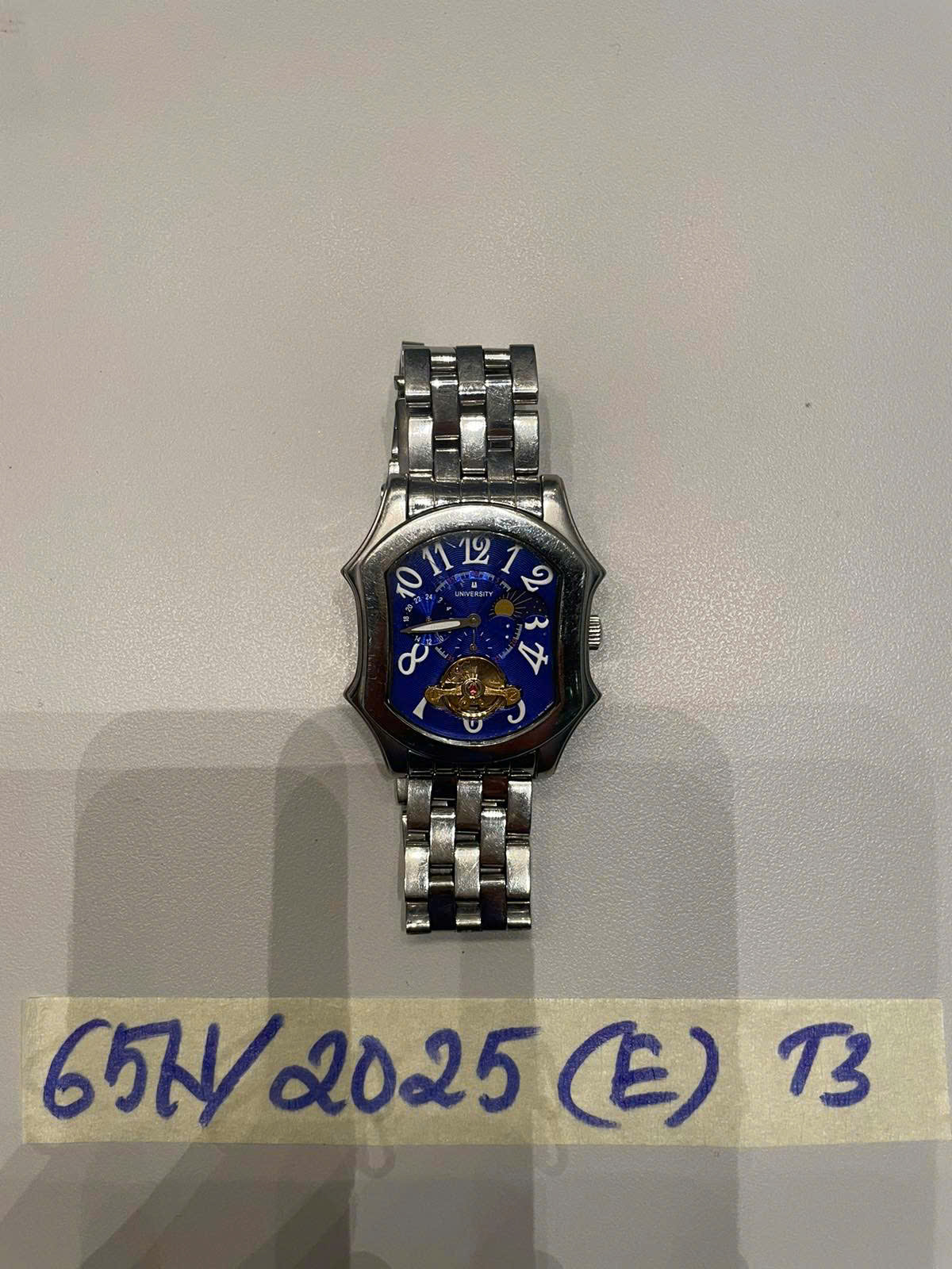 Ngày tiếp nhận: 20/10/2025 Mã hồ sơ: 65N2025E Mô tả: 01 đồng hồ kim loại màu bạc có chữ UNIVER SITY. |
