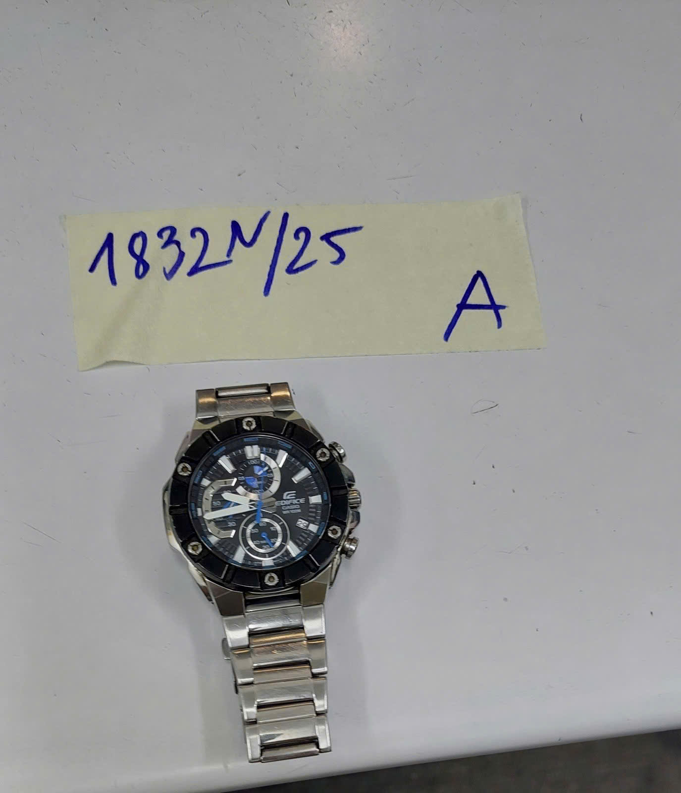 Ngày tiếp nhận: 10/10/2025 Mã hồ sơ: 1832N2025A Mô tả: 01 đồng hồ bằng kim loại mặt tròn màu đen có chữ "EDIFICE CASIO", dây kim loại màu bạc. |