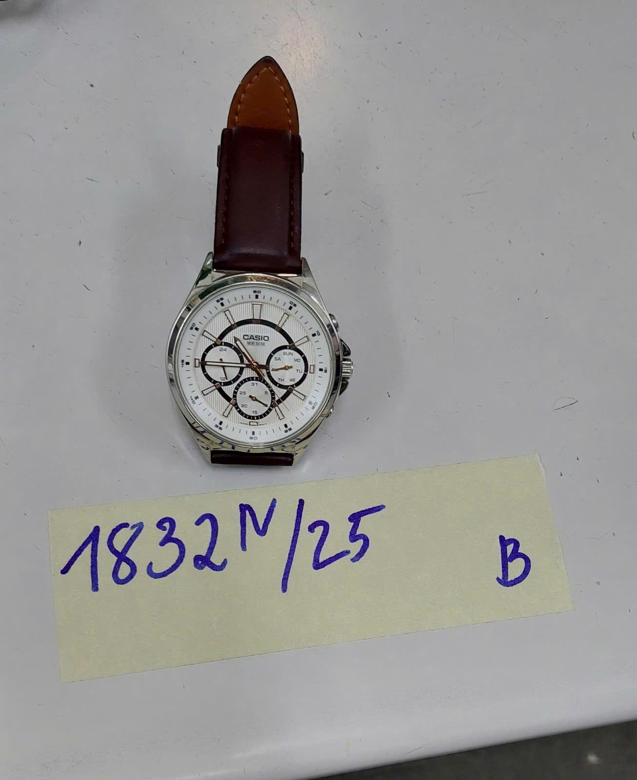 Ngày tiếp nhận: 10/10/2025 Mã hồ sơ: 1832N2025B Mô tả: 01 đồng hồ bằng kim loại mặt tròn màu đen có chữ "CASIO", dây giống da màu nâu. |