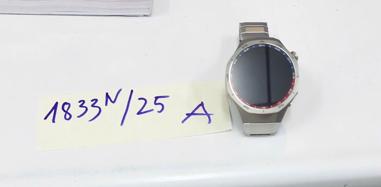 Ngày tiếp nhận: 10/10/2025 Mã hồ sơ: 1833N2025A Mô tả: 01 đồng hồ thông minh màu trắng có chữ "HUAWEI", dây kim loại màu trắng. |