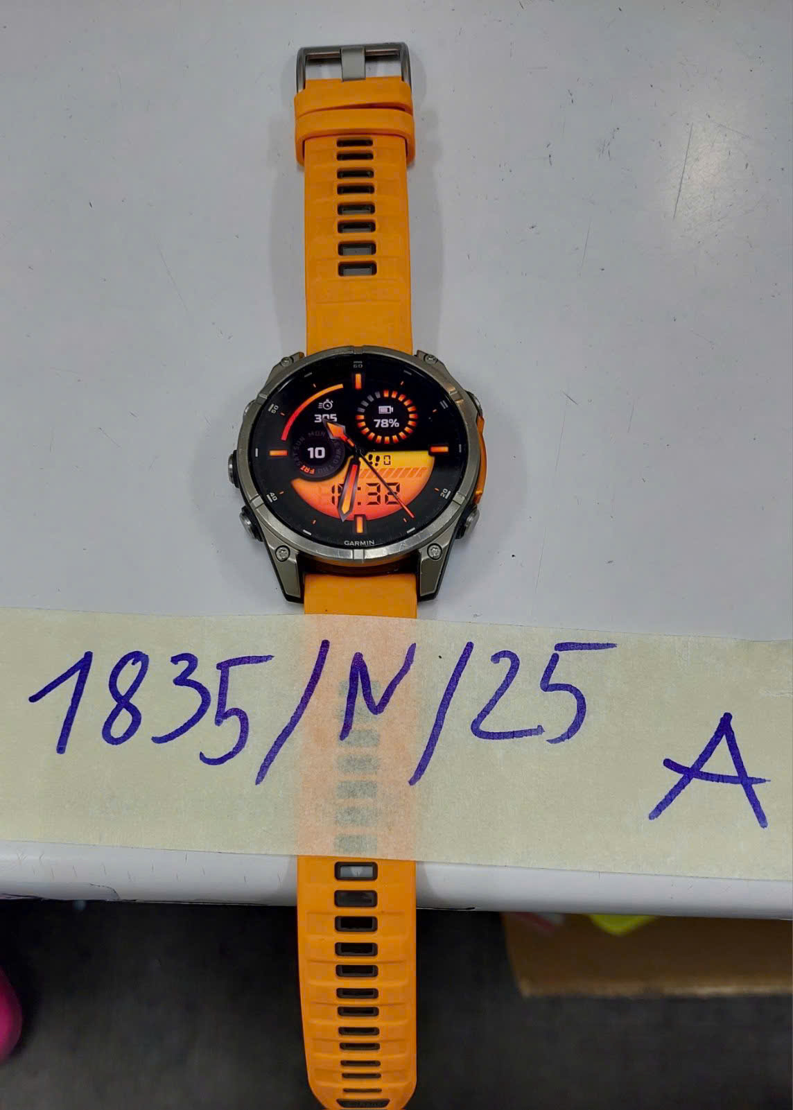Ngày tiếp nhận: 10/10/2025 Mã hồ sơ: 1835N2025A Mô tả: 01 đồng hồ điện tử màu xám mặt tròn có chữ "GARMIN", mặt sau có chữ "FENIX 8", dây đeo bằng silicone màu cam. |