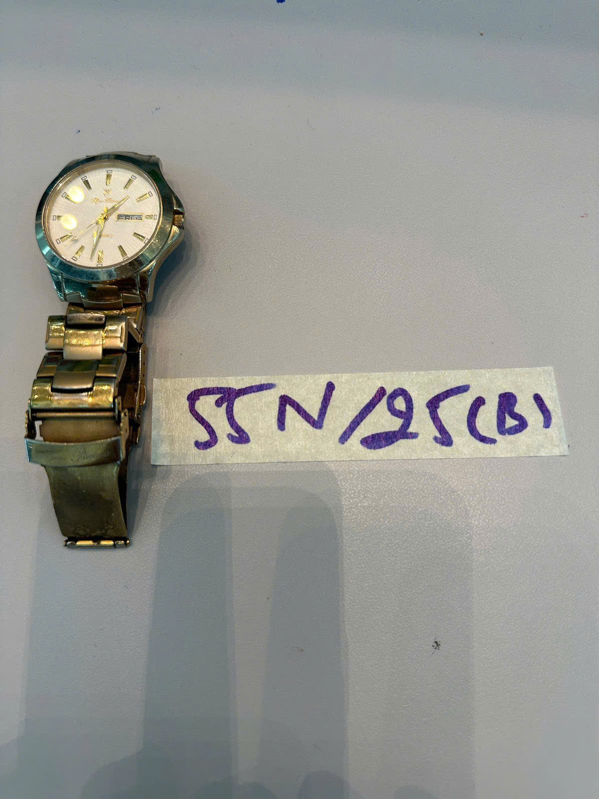 Ngày tiếp nhận: 10/10/2025 Mã hồ sơ: 55N2025B Mô tả: 01 đồng hồ dây kim loại màu vàng hiệu "Sapphire". |