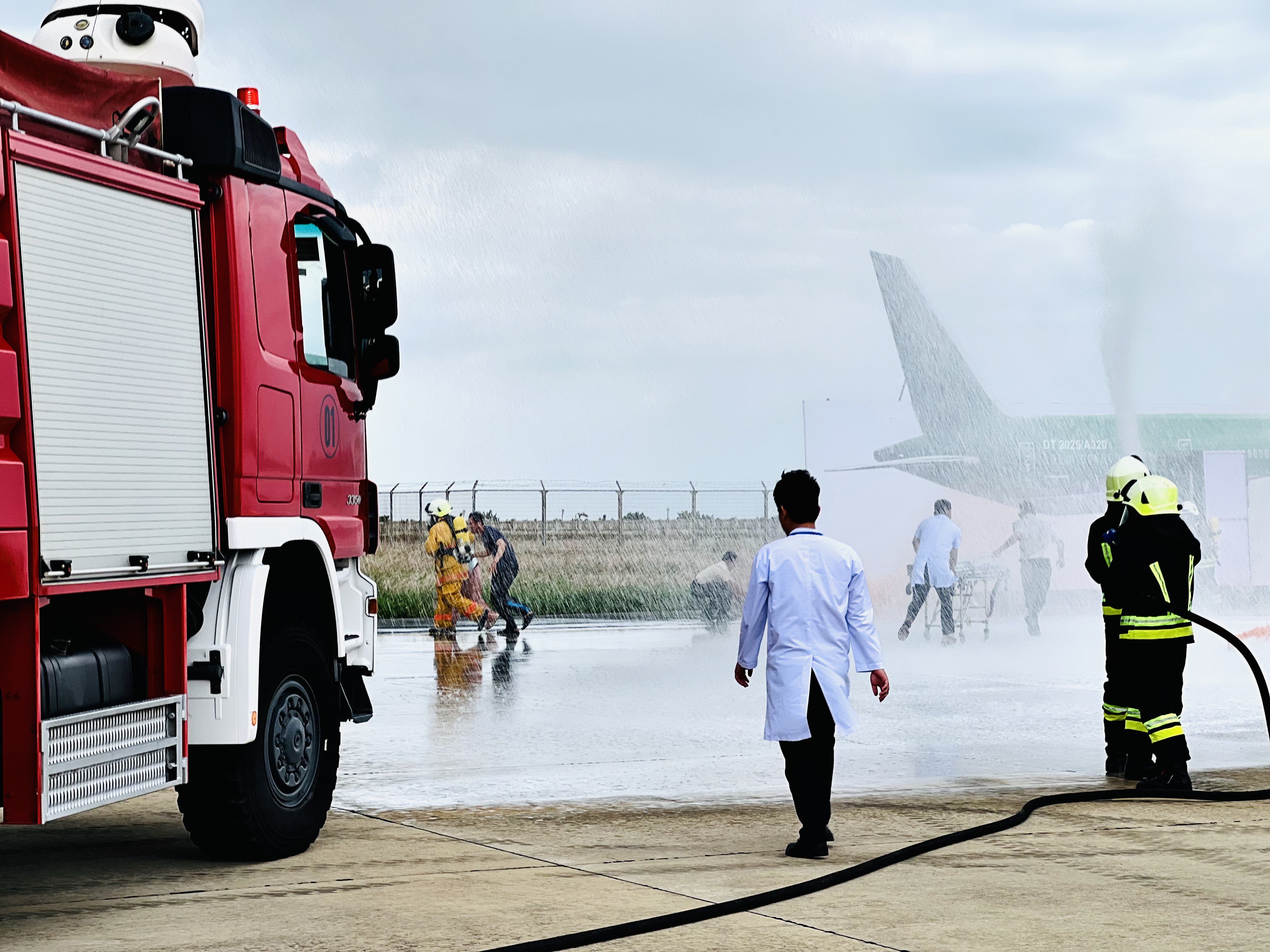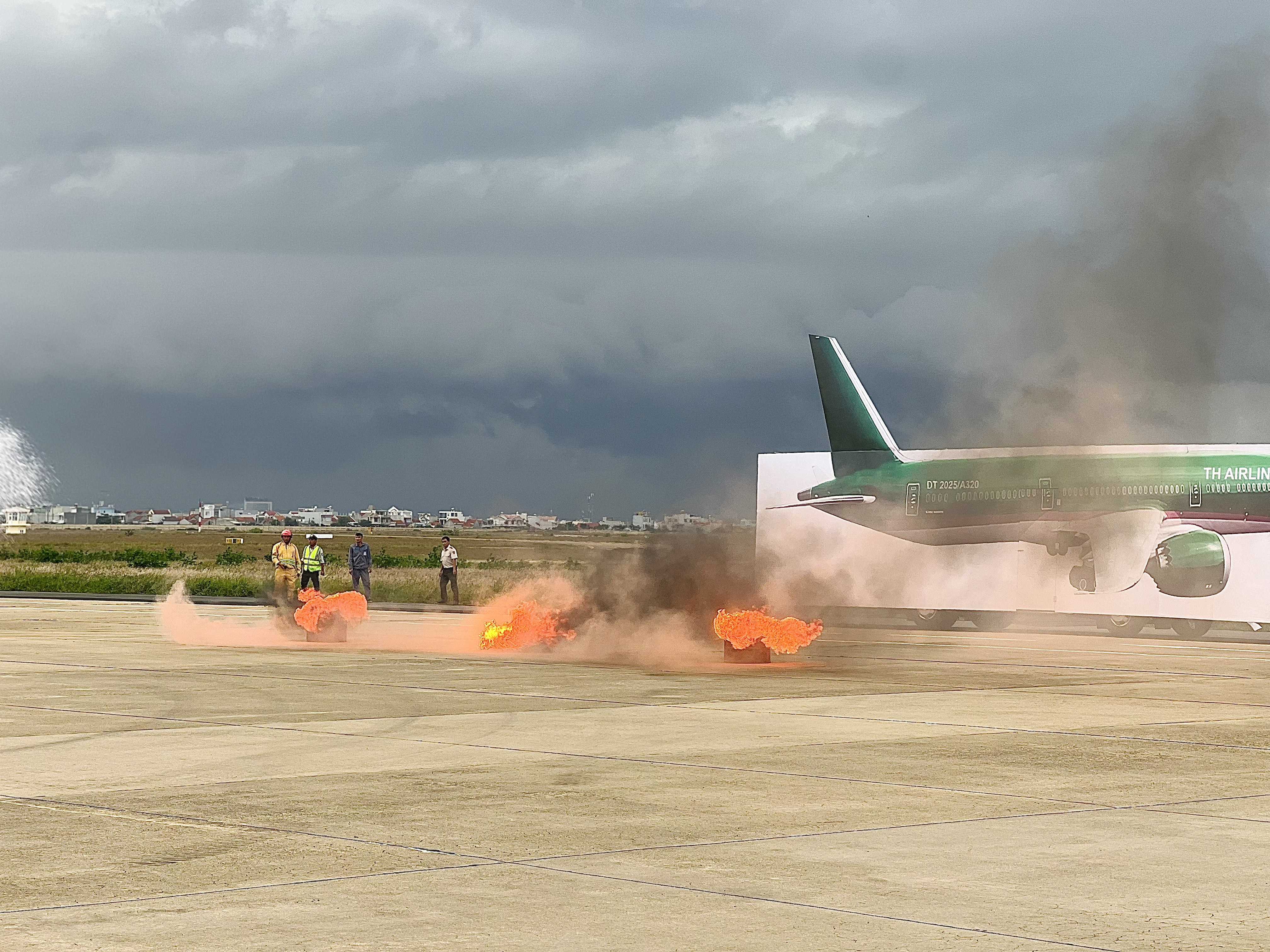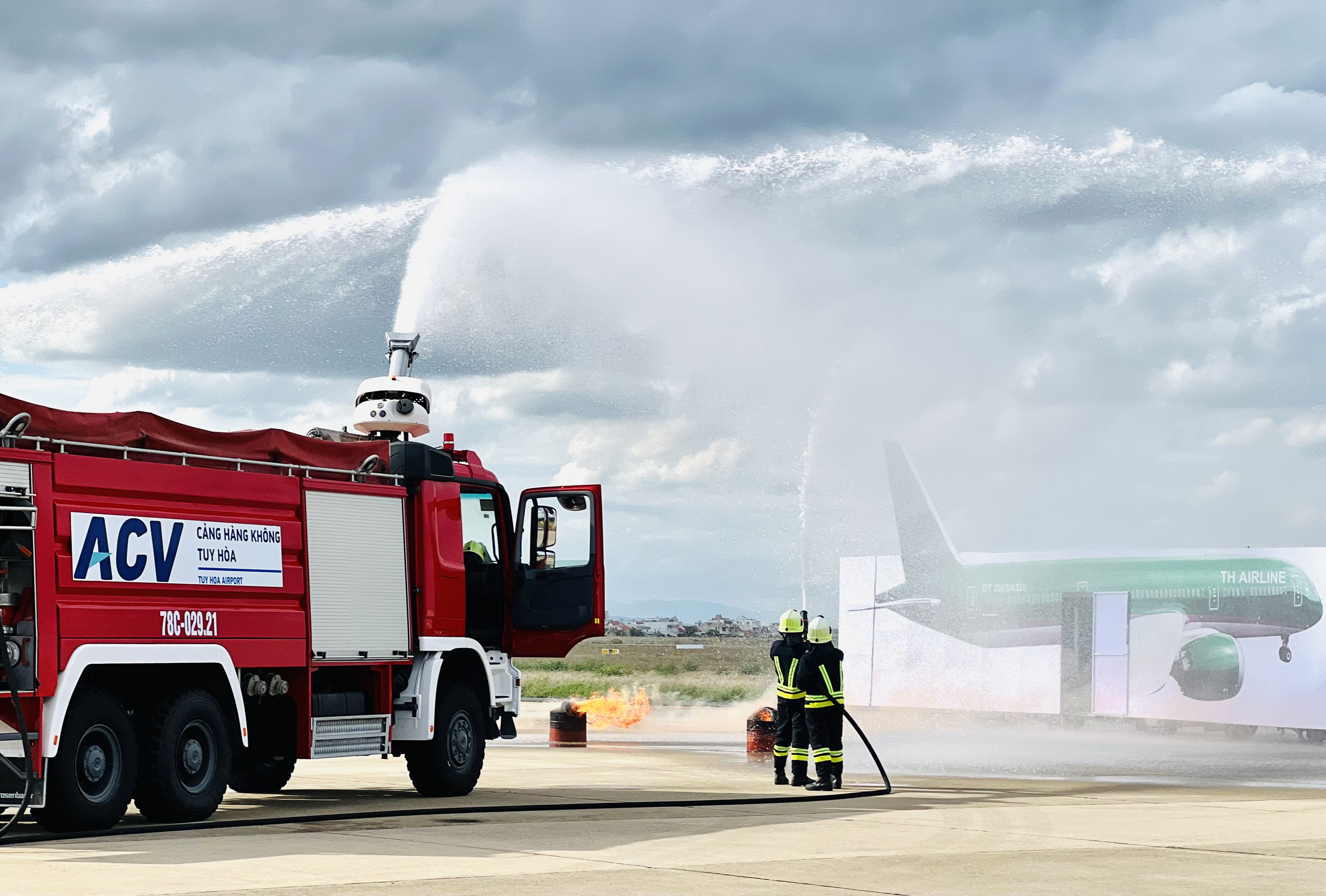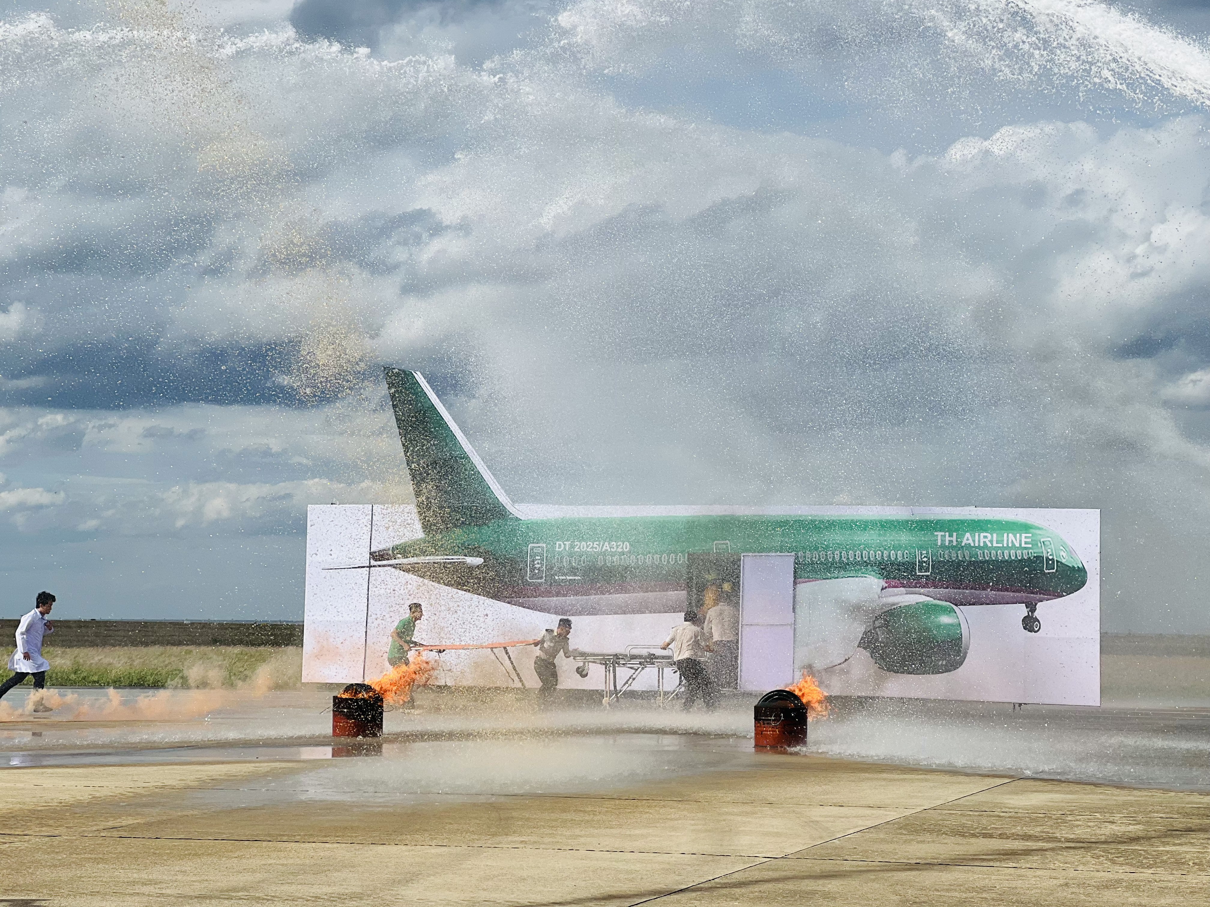 Diễn tập cấp cơ sở về PCCC&CNCH năm 2025 lấy tình huống giả định “Lúc 14h00, chuyến bay mang số hiệu DT2025 loại tàu bay A321 của hãng hàng không TH Airlines có lịch trình bay Tuy Hòa – Hà Nội sau khi hoàn tất việc tiếp nhận hành khách lên tàu bay, vì lý do thời tiết xấu tại Hà Nội tổ bay quyết định tiếp thêm nhiên liệu trước khi cất cánh. Trong quá trình tra nạp, do sự cố rò rỉ đường ống, dầu tràn ra ngoài và bén lửa, gây cháy tại khu vựng nhiên liệu loang và ngọn lửa nhanh chóng lan sang tàu bay gây nổ buồng nhiên liệu khu vực cánh tàu bay làm 04 nhân viên mặt đất bị thương nặng và 40 hành khách mắc kẹt trong tàu bay.