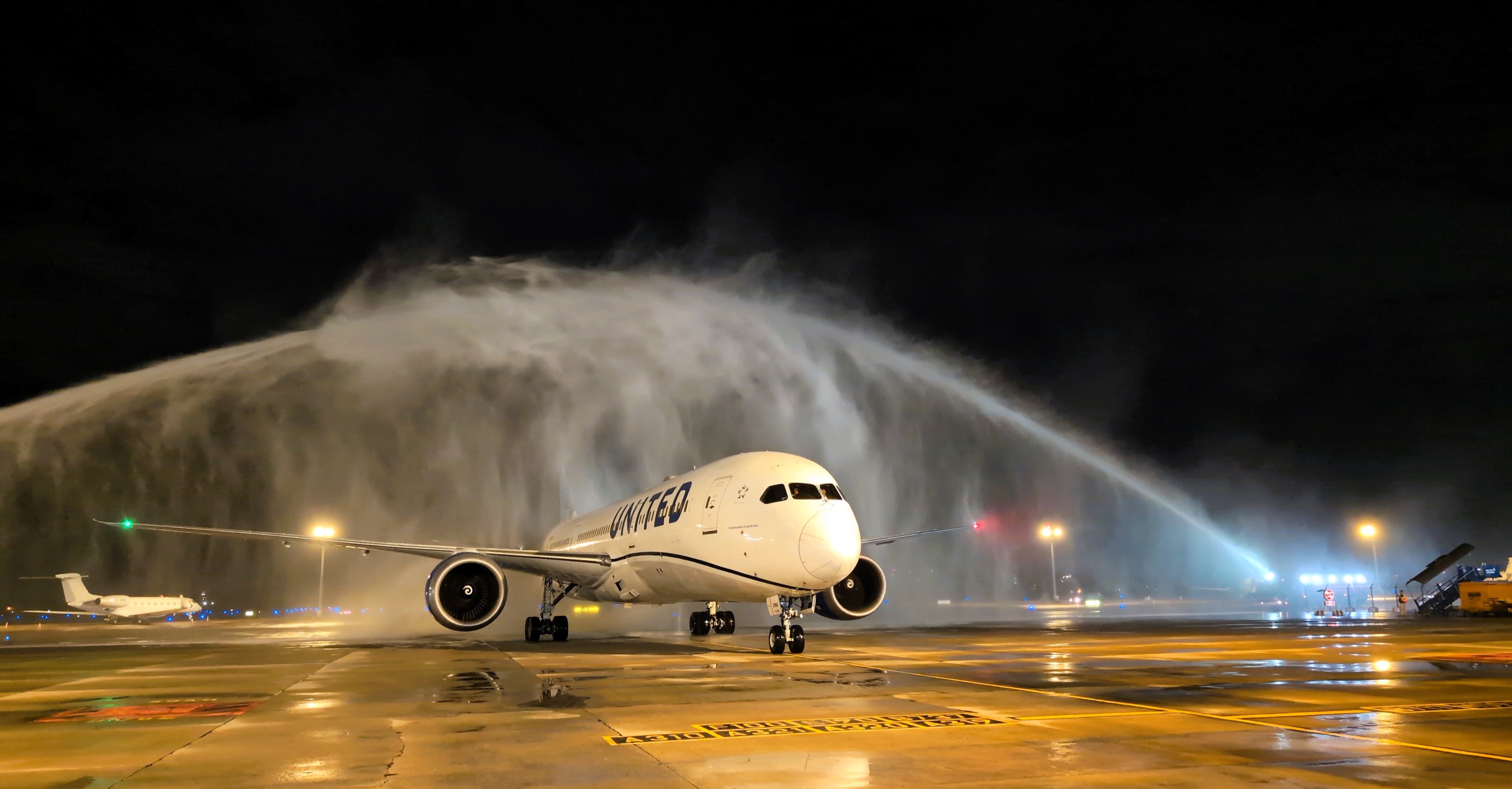 Nghi thức phun vòi rồng chào đón chuyến bay đầu tiên của United Airlines tại Cảng HKQT Tân Sơn Nhất
