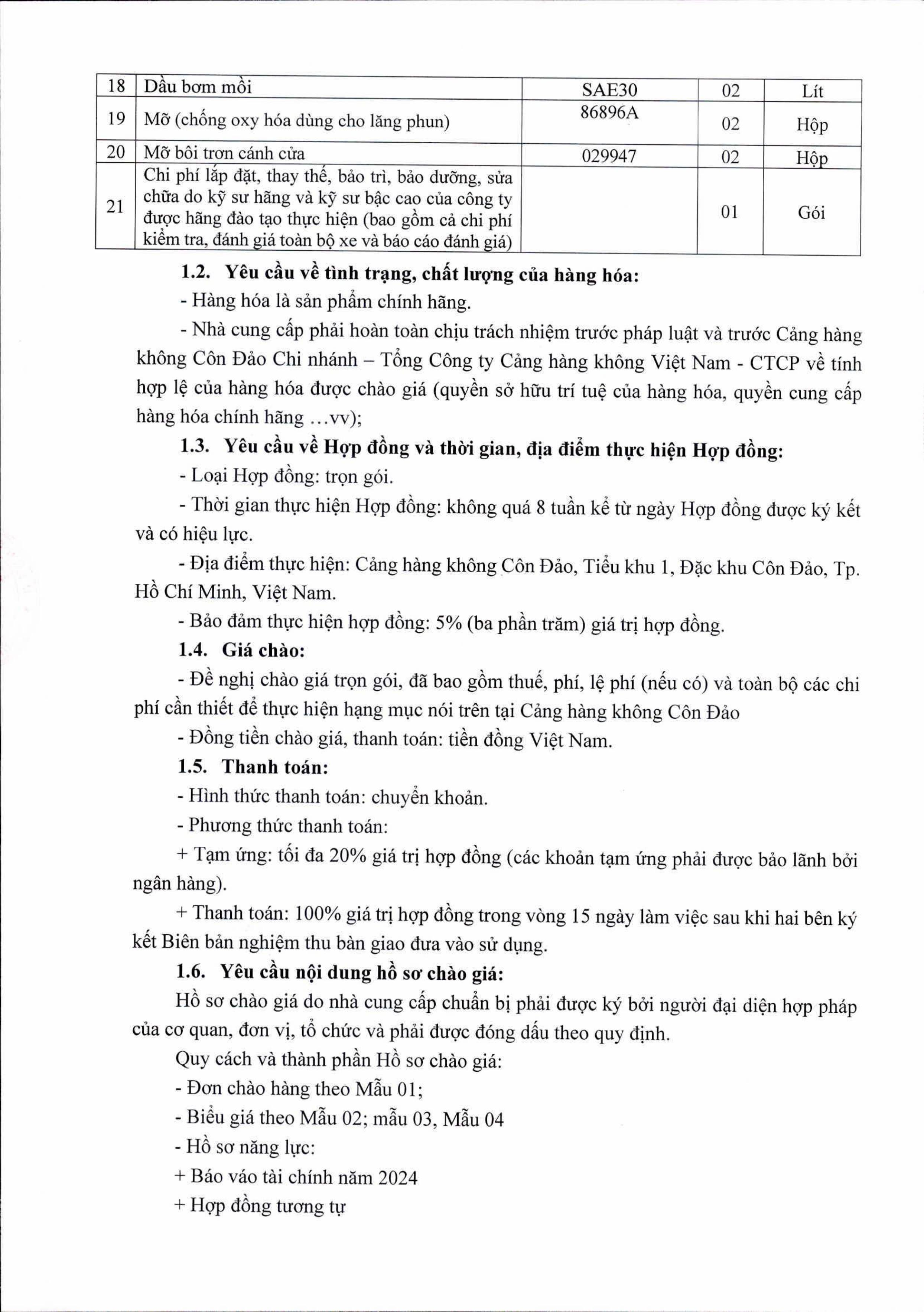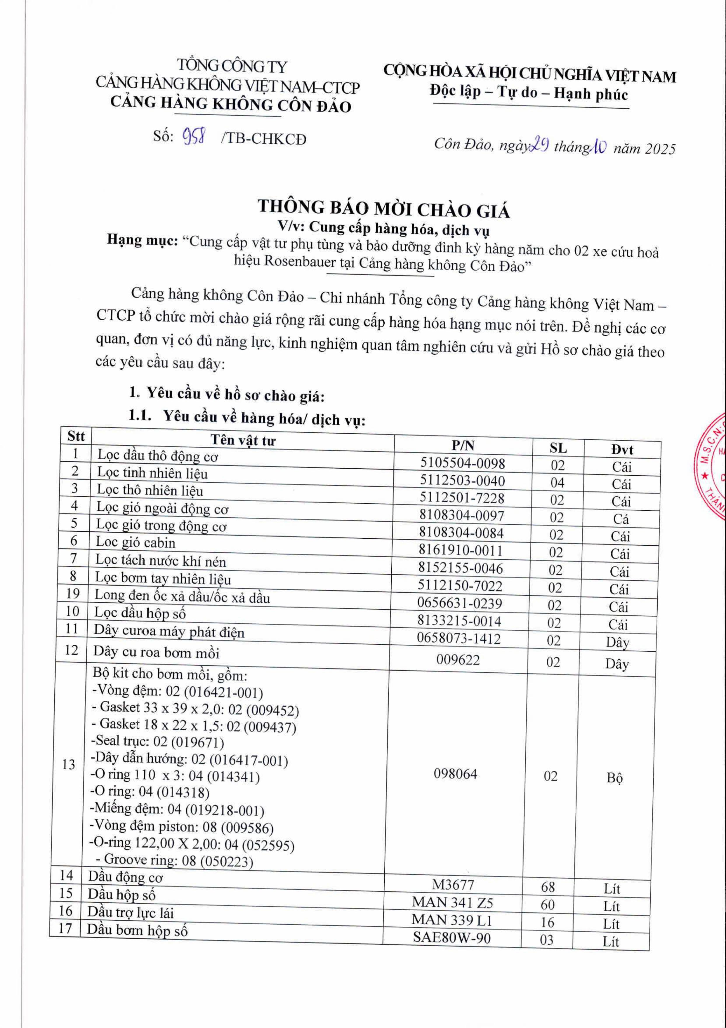 THÔNG BÁO MỜI CHÀO GIÁ V/v: Cung cấp hàng hóa, dịch vụ Hạng mục: "Cung cấp vật tư phụ tùng và bảo dưỡng định kỳ hàng năm cho 02 xe cứu hỏa hiệu Rosenbauer tại Cảng hàng không Côn Đảo"