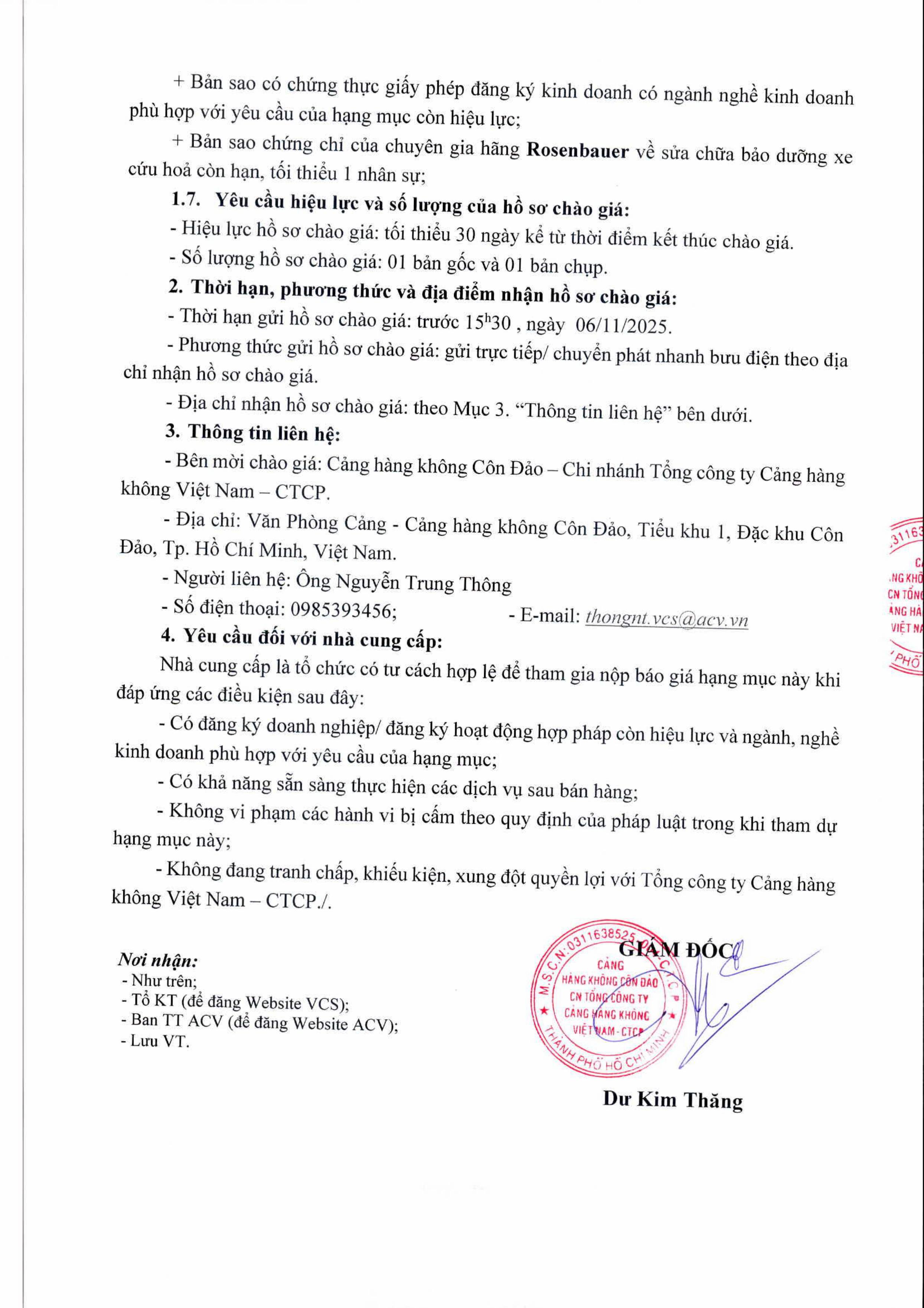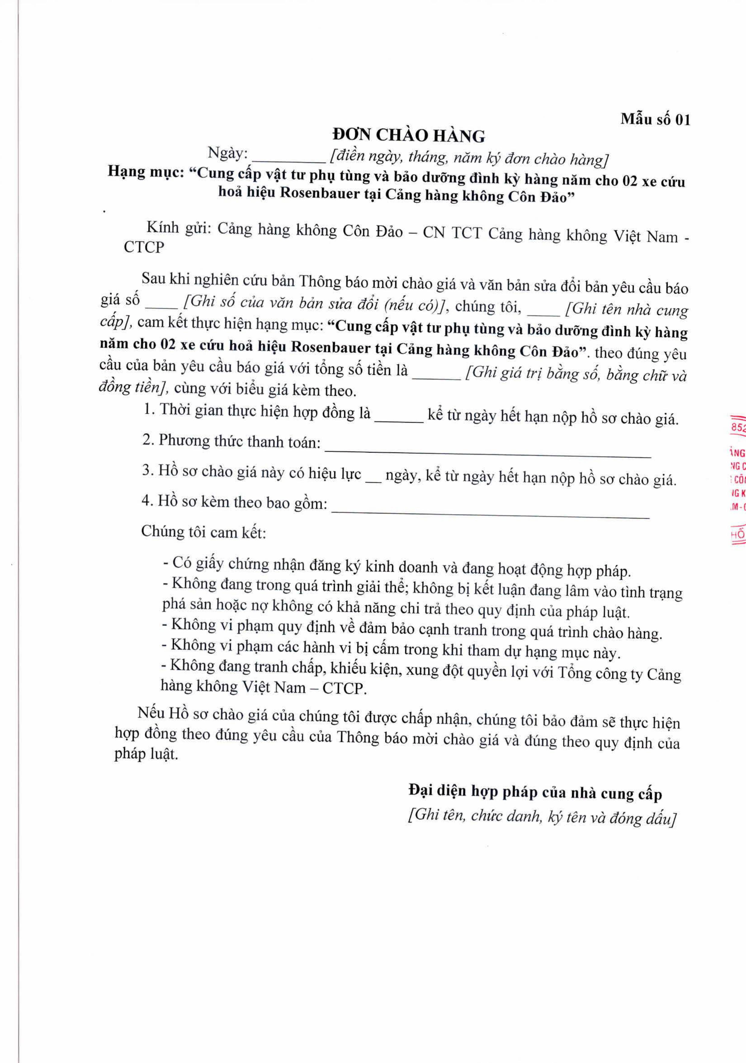 THÔNG BÁO MỜI CHÀO GIÁ V/V: CUNG CẤP VẬT TƯ PHỤ TÙNG VÀ BẢO DƯỠNG ĐỊNH KỲ HÀNG NĂM CHO 02 XE CỨU HỎA HIỆU ROSENBAUER TẠI CẢNG HÀNG KHÔNG CÔN ĐẢO