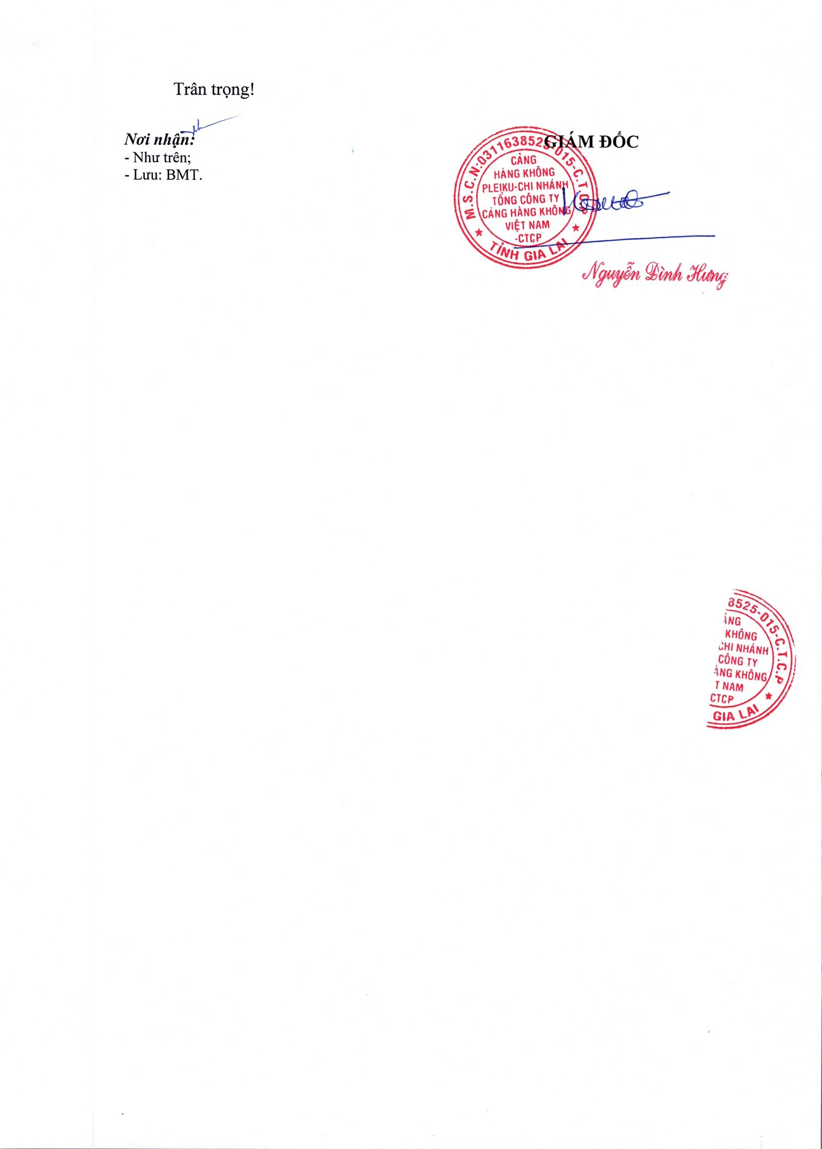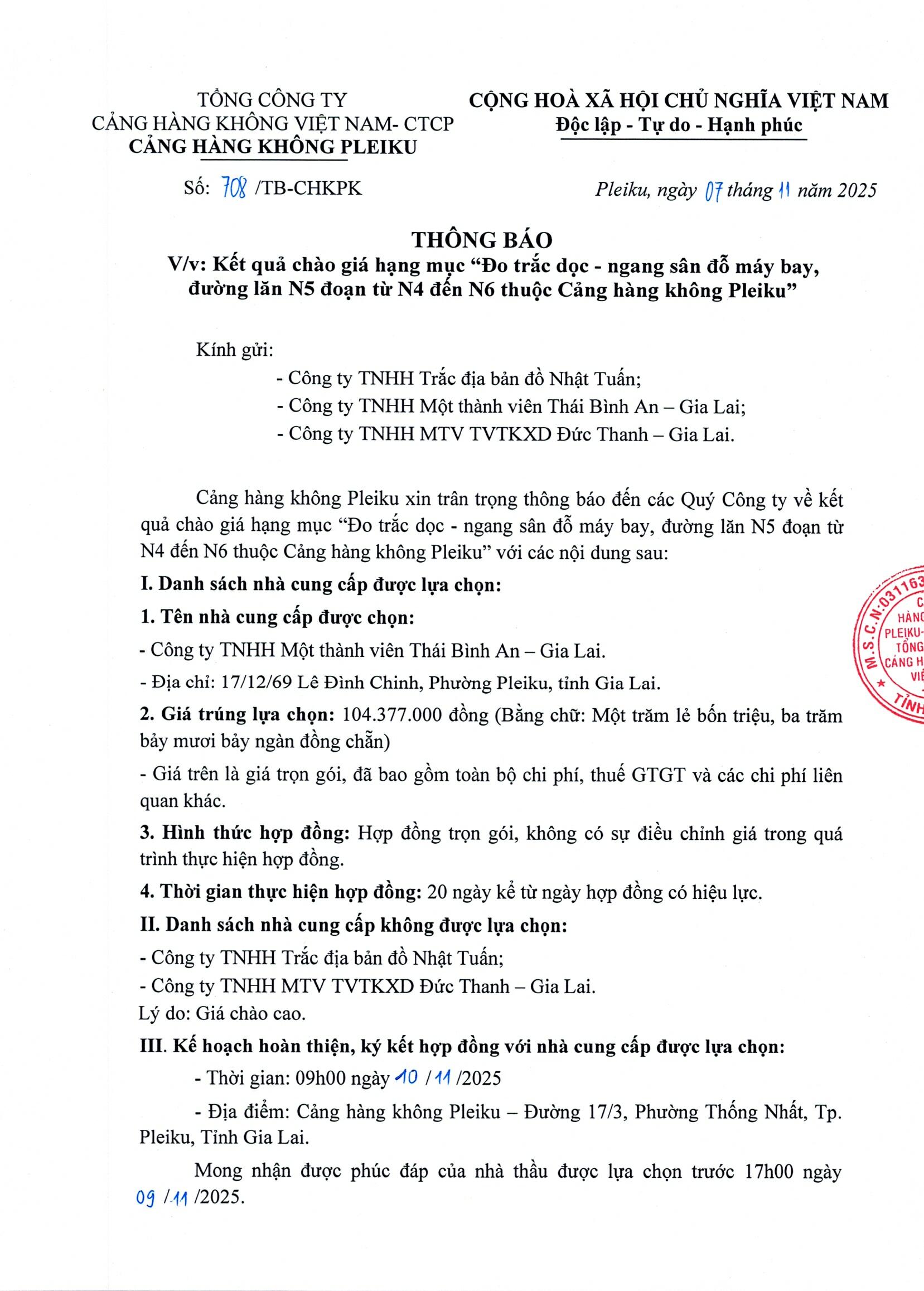 Thông báo kết quả chào giá hạng mục: "Đo trắc dọc - ngang sân đỗ máy bay, đường lăn N5 đoạn từ N4 đến N6 thuộc Cảng hàng không Pleiku"