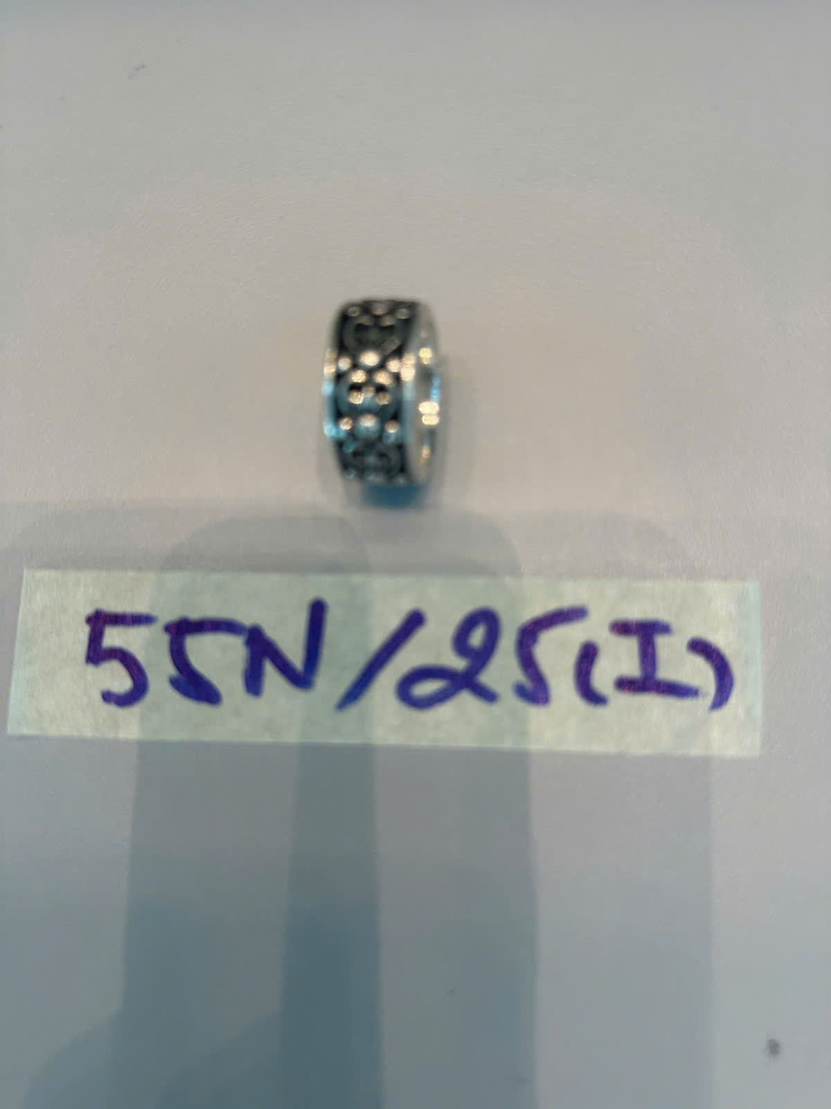 Ngày tiếp nhận: 10/10/2025 Mã hồ sơ: 55N2025I Mô tả: 01 nhẫn kim loại màu trắng có hoa tiết cây đinh. |