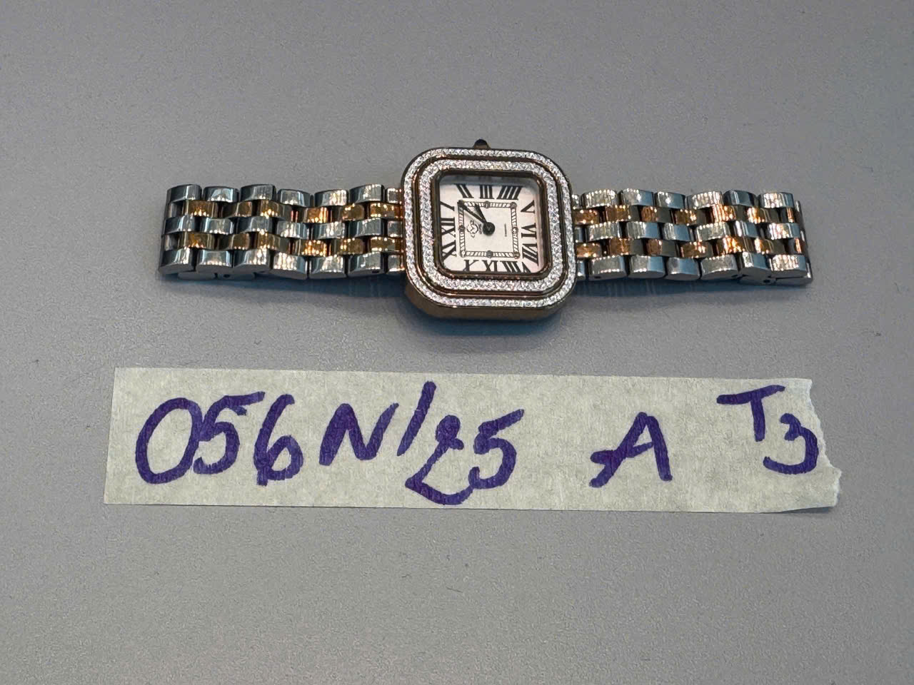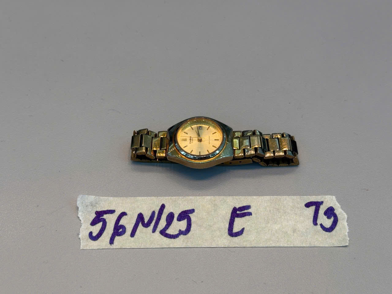 Ngày tiếp nhận: 11/10/2025 Mã hồ sơ: 56N2025A Mô tả: 01 đồng hồ dây kim loại mặt vuông màu vàng đã sử dụng. |