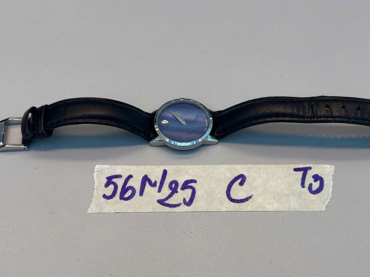 Ngày tiếp nhận: 11/10/2025 Mã hồ sơ: 56N2025C Mô tả: 01 đồng hồ dây da màu đen, mặt kim loại màu tím, chữ MOVADO ở mặt sau, mặt đồng hồ hình tròn, đã sử dụng. |