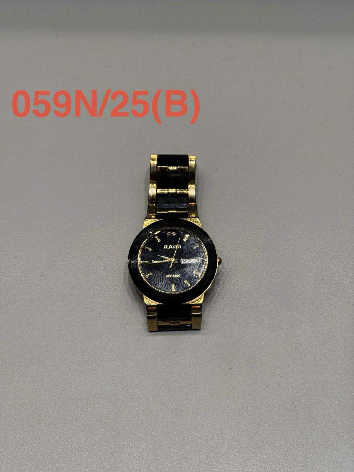 Ngày tiếp nhận: 13/10/2025 Mã hồ sơ: 59N2025B Mô tả: 01 đồng hồ dây kim loại vàng đen chữ RADO. |