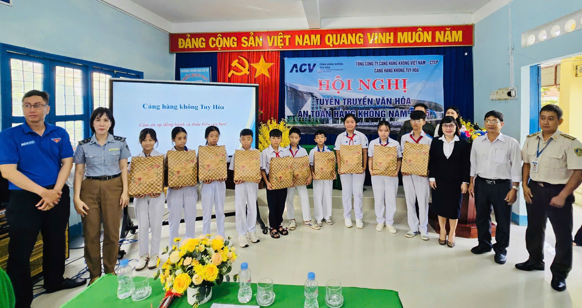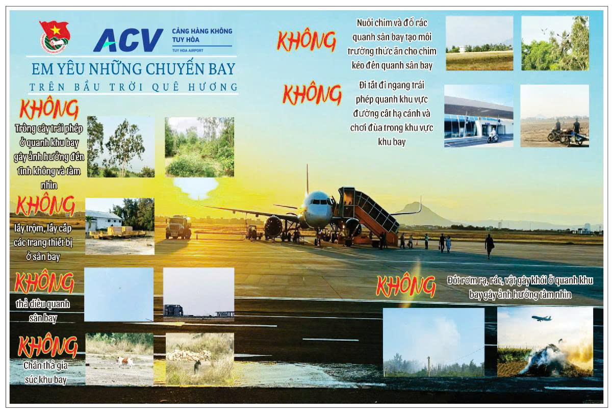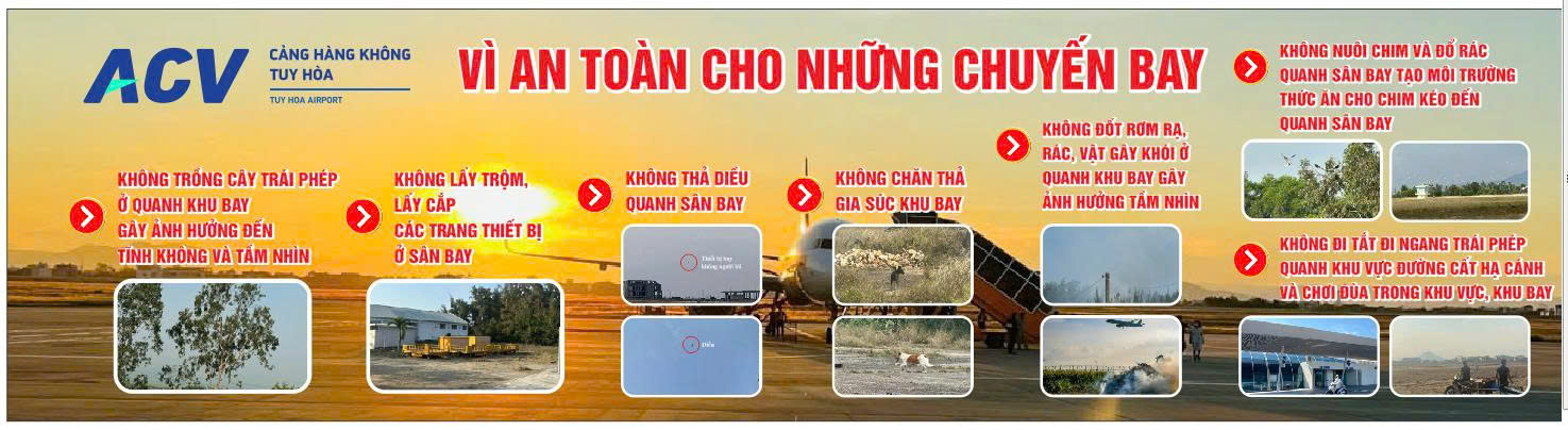 Bên cạnh đó, Cảng hàng không Tuy Hòa cũng lắp đặt các bảng tuyên truyền “Văn hóa an toàn hàng không” tại Trường THCS Trần Hưng Đạo và Trường Tiểu học Lê Hồng Phong (phường Phú Yên), nhằm lan tỏa thông điệp “An toàn hàng không, trách nhiệm của mọi người” đến cộng đồng dân cư khu vực lân cận sân bay.