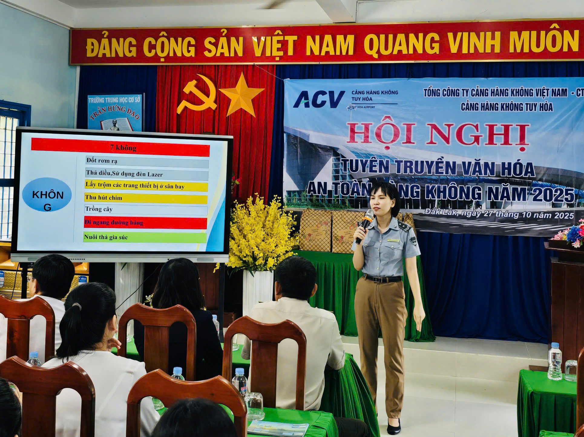 Sáng ngày 27/10/2025, Cảng hàng không Tuy Hòa phối hợp với Trường THCS Trần Hưng Đạo (phường Phú Yên, tỉnh Đắk Lắk) tổ chức Chương trình tuyên truyền, nâng cao nhận thức về văn hóa an toàn hàng không.